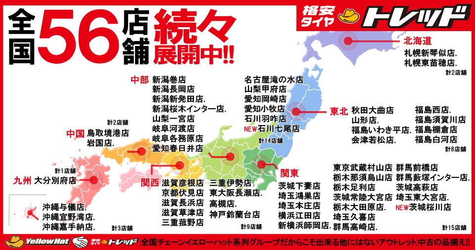 タイヤとホイールを中心に抜群の品揃えと激安価格でお客様のご期待に応える「トレッド」。高品質・低価格をモットーに、経験豊富な専門スタッフによる親切サポートで、安心してご利用頂けます。