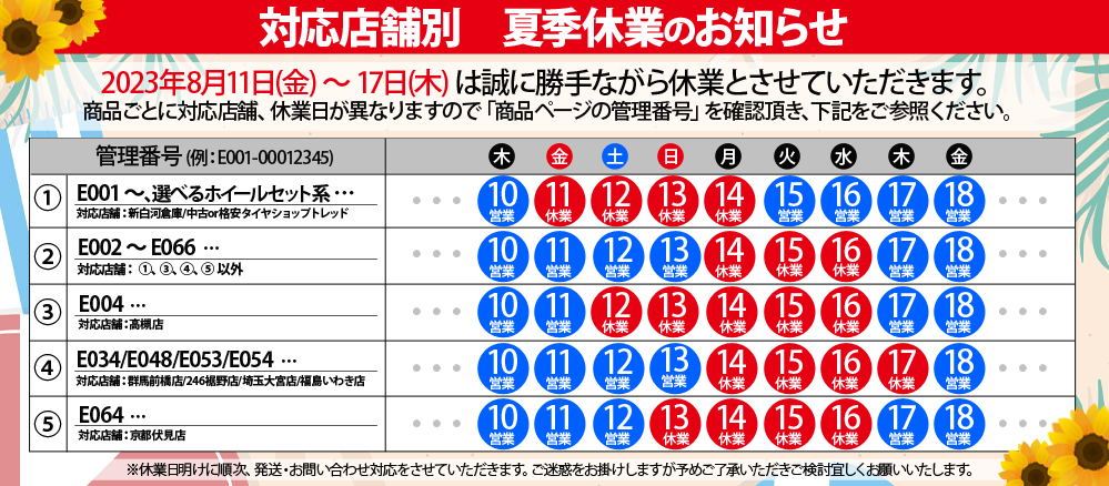 格安タイヤトレッド「高槻店」8月度定休日のお知らせ